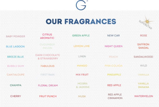 Every G’s Breeze essential oil air freshener is made from quality-tested, authentic ingredients. We offer 36 varieties of wholesome fragrances designed to delight your senses. Our collection includes: