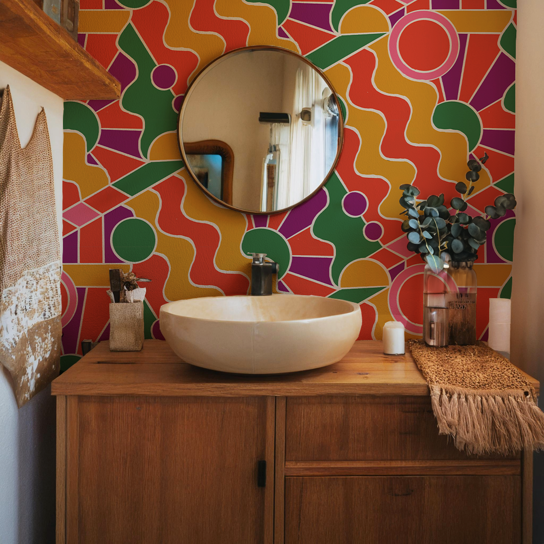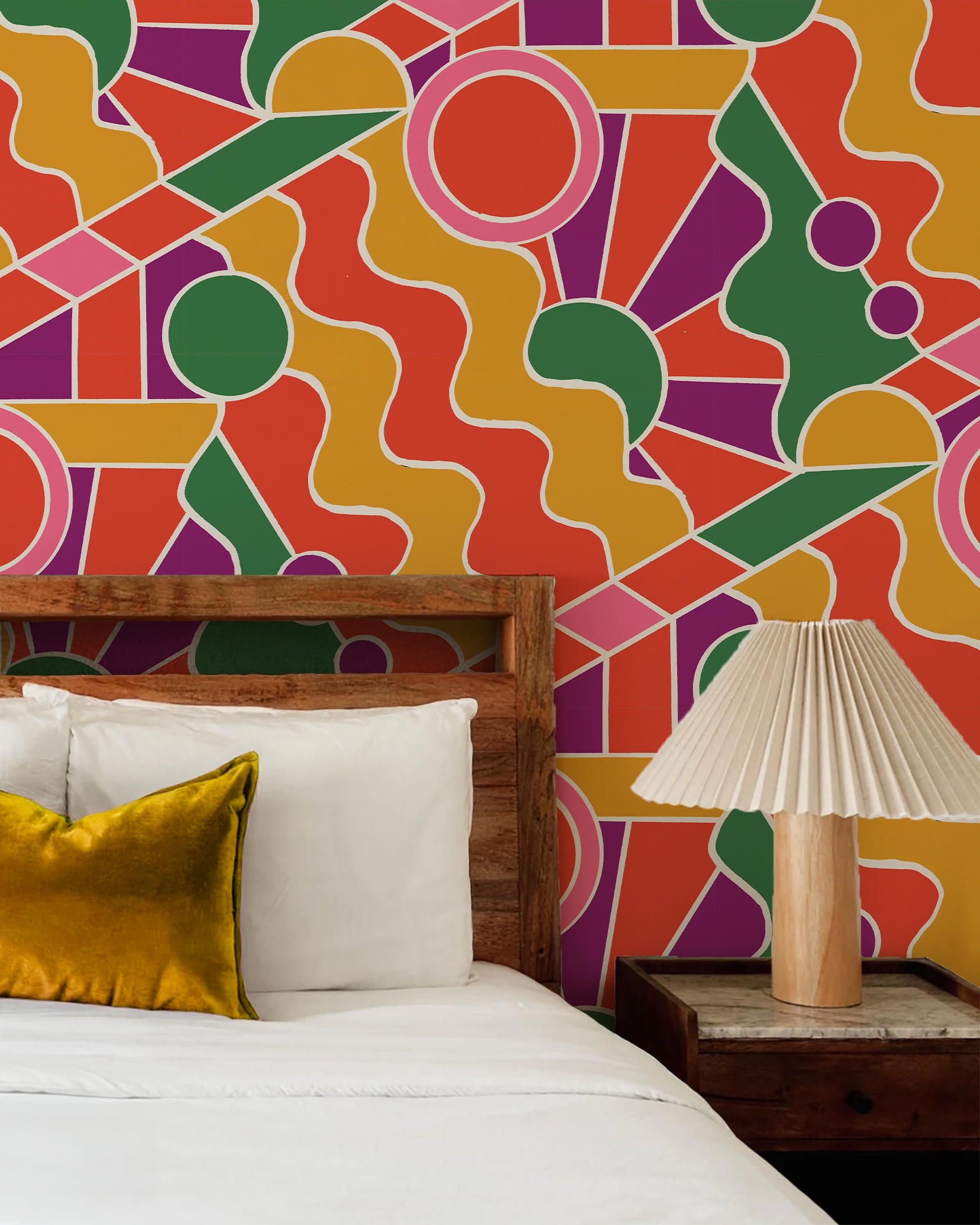 Get ready to add a pop of funky, fun, bold, and colorful retro stained glass to your walls with Day Trippin' Wallpaper! Designed by Samantha Santana, this wallpaper is available in both peel and stick vinyl and traditional pasted options, making it easy to install. And the best part? It's completely removable!